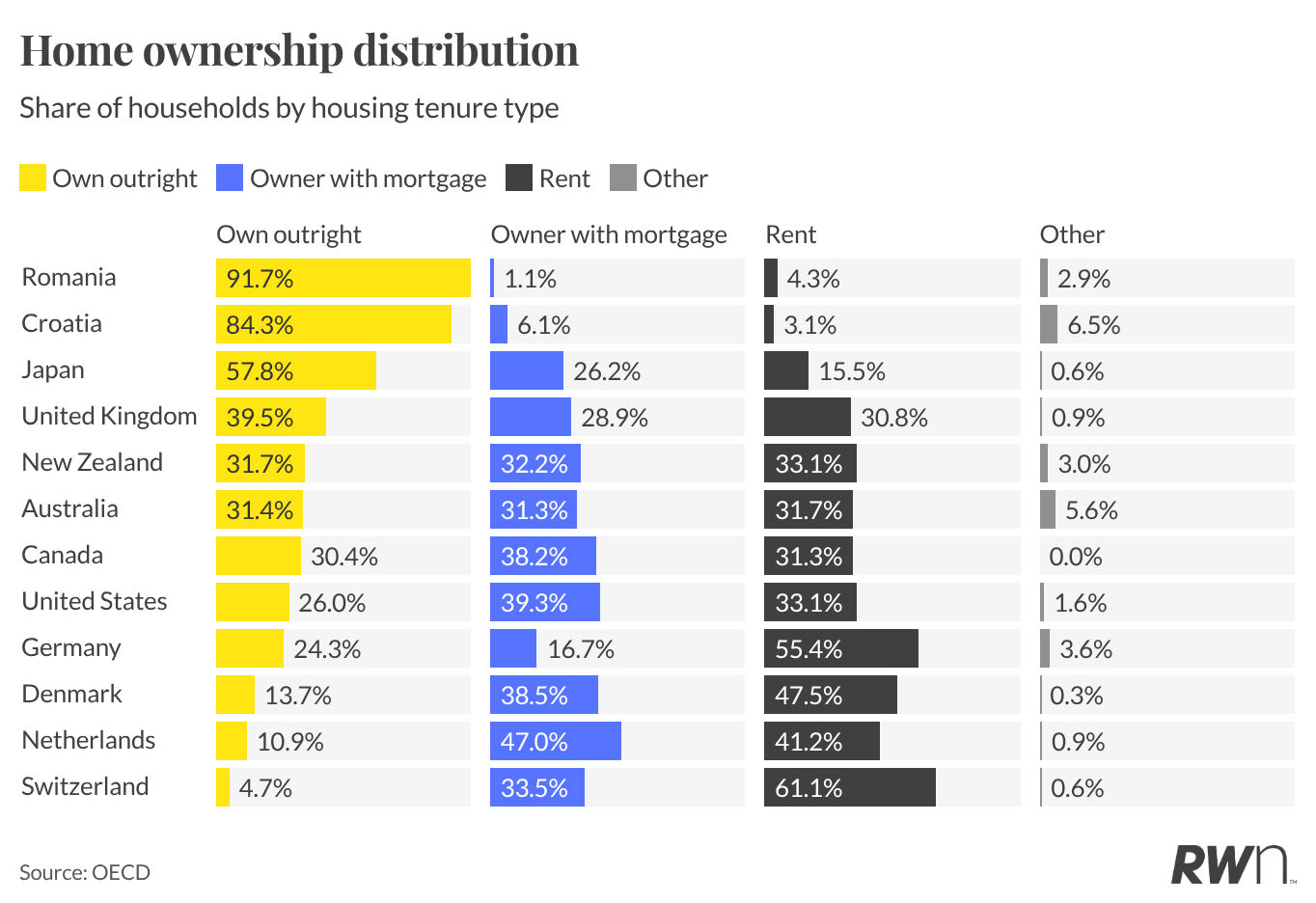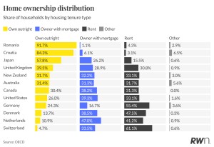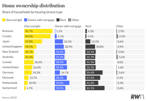 Among OECD countries, Romania (91.7 per cent) and Croatia (84.3 per cent) have the highest share of households who own outright. But their high rates trace back to a single policy event: the mass transfer of state housing stock to sitting tenants in the early 1990s. People own free and clear, which delivers real security of tenure. The downside is that the rental market never developed depth, so labour mobility is poor (hard to move for a job when renting is expensive and rare), housing quality is uneven, and property is often illiquid or hard to renovate. The geopolitical context these countries found themselves in is hardly easy to replicate for Australia now.